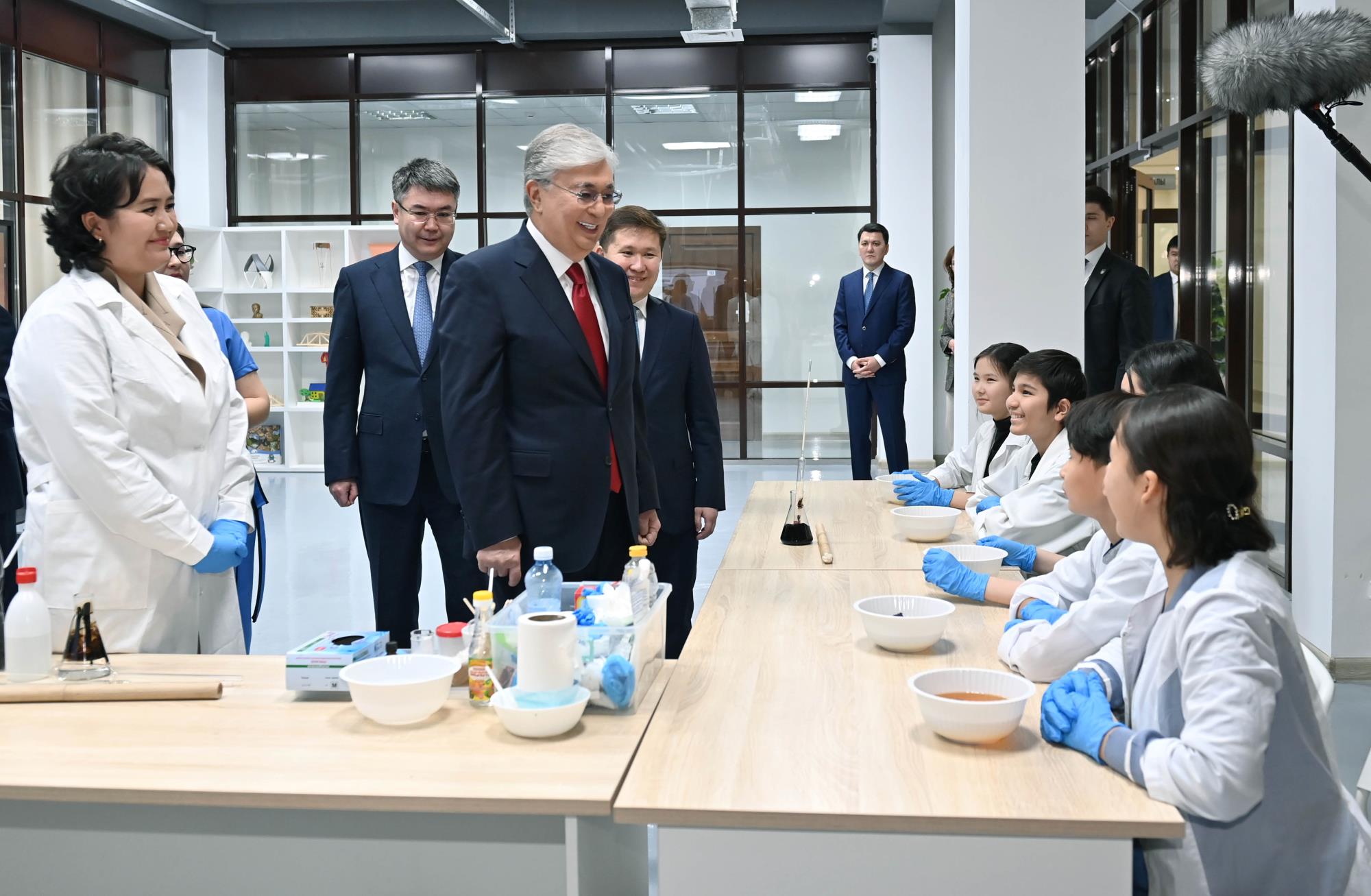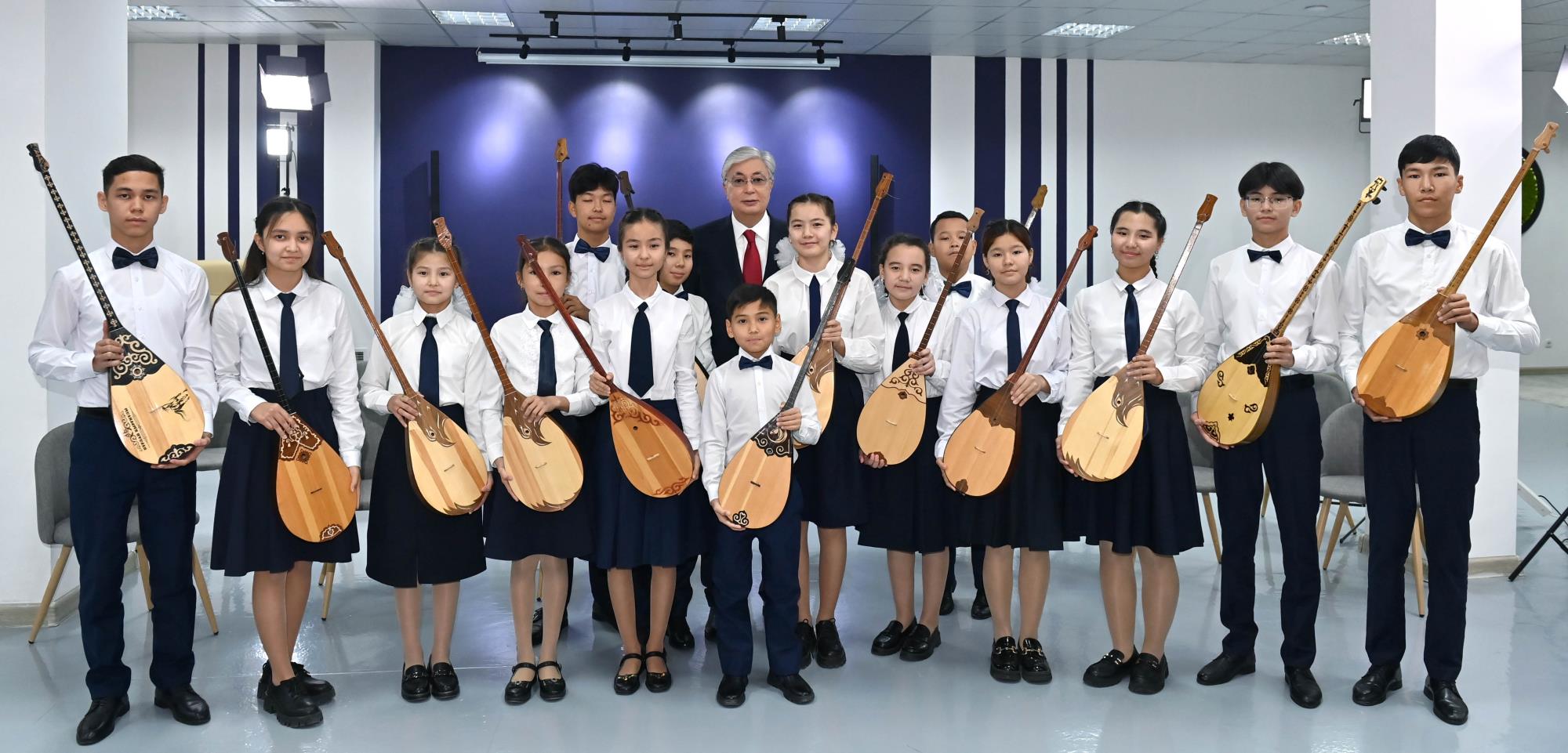 Президент осмотрел проекты, созданные в STEM-лаборатории JasSpace, а также послушал кюй Курмангазы «Балбырауын» в исполнении молодых домбристов.