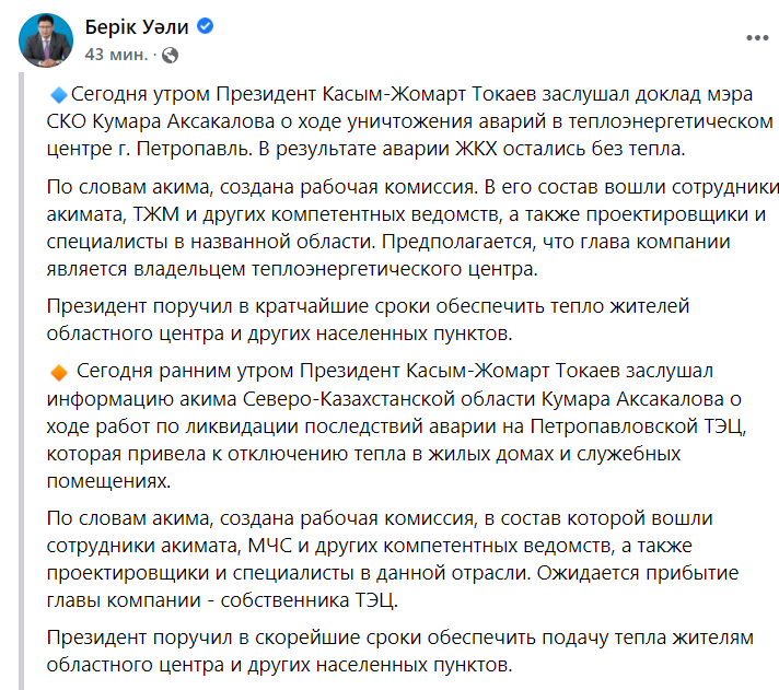 Утром 21 марта Касым-Жомарт Токаев заслушал информацию акима СКО Кумара Аксакалова о ходе работ по ликвидации последствий аварии на Петропавловской ТЭЦ, передает Caravan.kz со ссылкой на пресс-секретаря Президента Берика Уали.