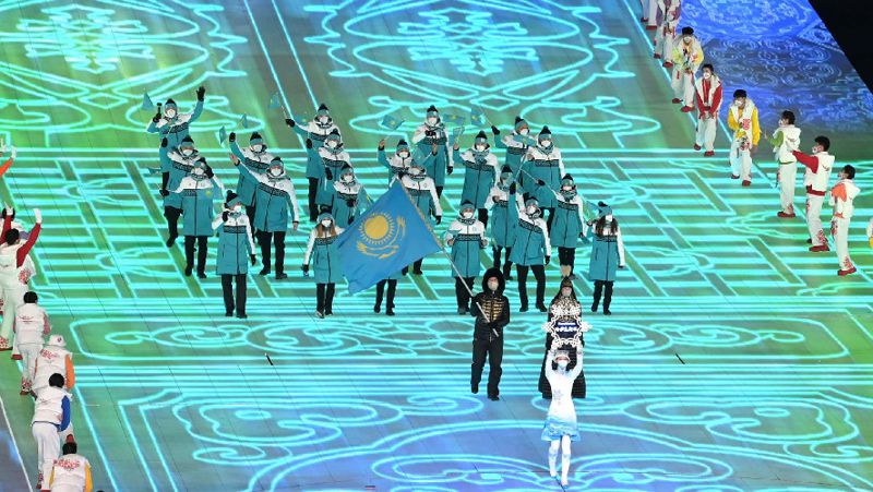 Государственный флаг Казахстана во время прохода команд-участниц Олимпиады пронесли шорт-трекист Абзал Ажгалиев и конькобежка Екатерина Айдова.