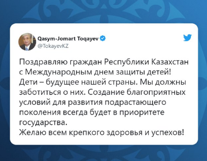 – Поздравляю граждан Республики Казахстан с Международным днем защиты детей! Дети – будущее нашей страны. Мы должны заботиться о них. Создание благоприятных условий для развития подрастающего поколения всегда будет в приоритете государства. Желаю всем крепкого здоровья и успехов! – написал президент.