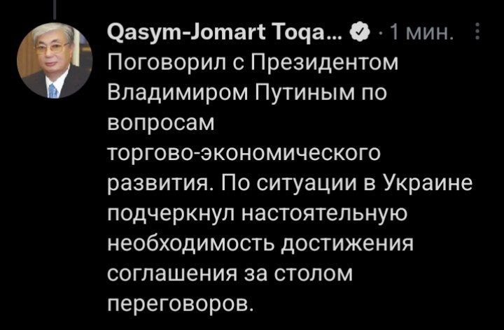 "Поговорил с Президентом Владимиром Путиным по вопросам торгово-экономического развития. По ситуации в Украине подчеркнул настоятельную необходимость достижения соглашения за столом переговоров", — написал Касым-Жомарт Кемелевич.