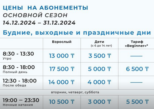 Ранее они стоили 7600 тенге в будни и 11 400 тенге в выходные, пишет Caravan.kz. Теперь стоимость посещения курорта составит 17 500 тенге в любой день. Помимо взрослого присутствуют тарифы для детей и новичков. Если кататься не полный день, билет будет стоить дешевле, но все еще дороже, чем на полный день ранее.