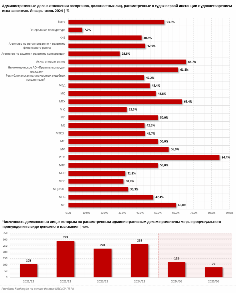 Иски против акиматов в 65,7% случаев заканчивались победой истцов. При этом в судебных спорах с Генеральной прокуратурой победили всего 7,7% обратившихся.