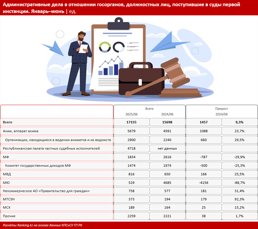 За первые шесть месяцев 2025-го казахстанцы подали заявления на госорганы и должностных лиц в суды первой инстанции около 17,2 тыс. раз, сообщает Caravan.kz со ссылкой на ranking.kz. Речь идёт об административных делах.