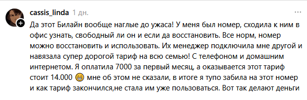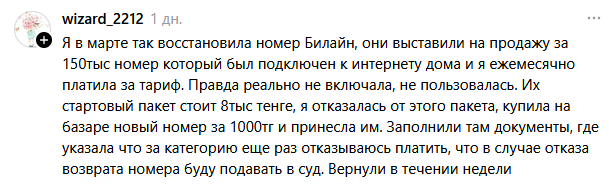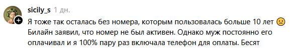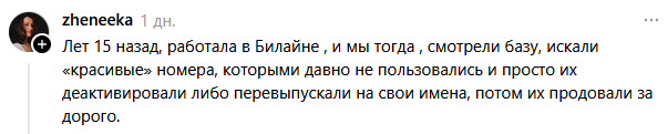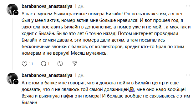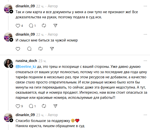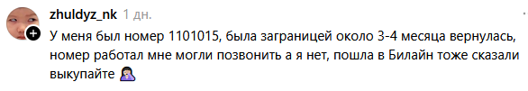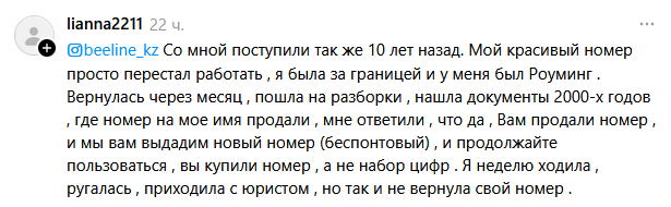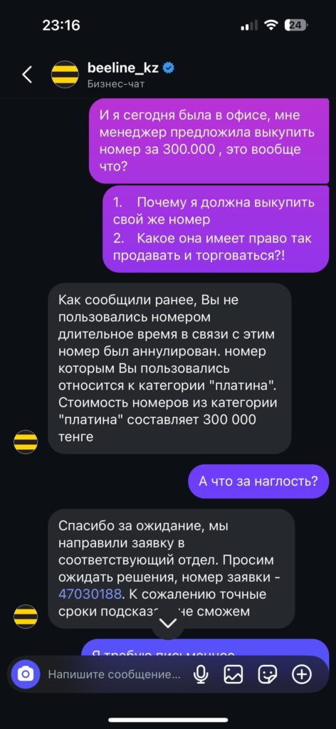 Как он стал «платиновым», если я его выкупила ещё 10 лет назад? Почему меня никто не предупредил, что номер аннулируется? И на каком основании теперь меня вынуждают выкупать его обратно? Я написала заявление, приложила удостоверение, всё как положено. И теперь Beeline мне объясняет это тем, что я якобы «долго не пользовалась номером» (хотя он был активен 24/7). Это как минимум — нарушение прав потребителя. Как максимум — мошенничество с номерами. Beeline, вы серьёзно?» — написала она, приложив скриншоты переписки с оператором.