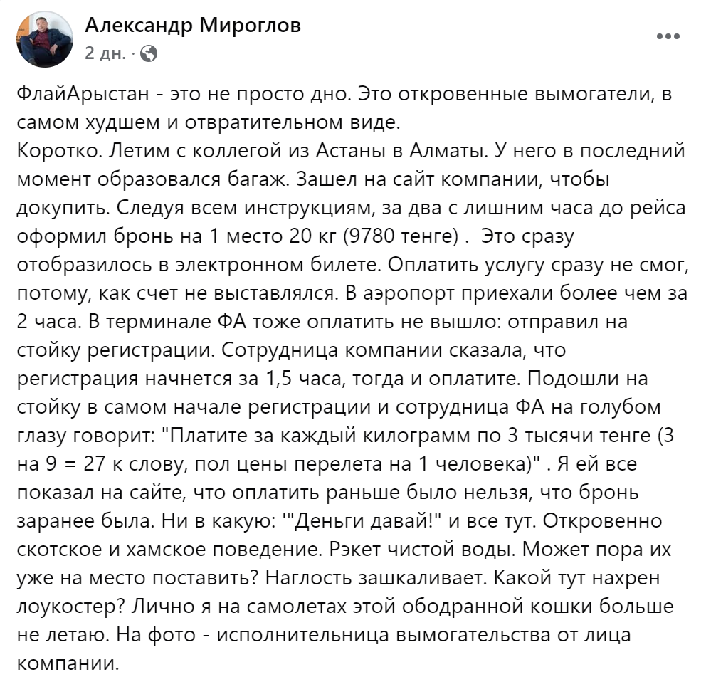 Казахстанец написал на странице Facebook о ситуации с компанией FlyArystan, в которую попал из-за проблем с багажом, сообщает Caravan.kz.
