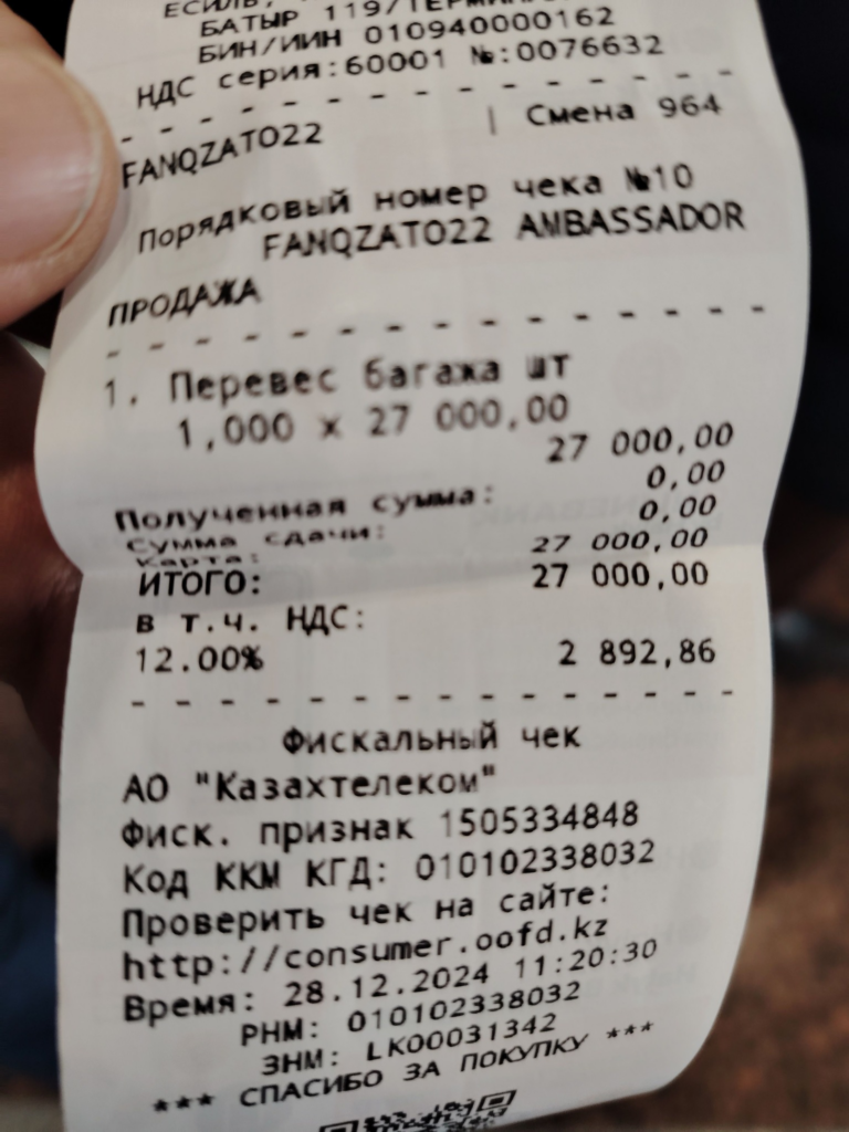 «Следуя всем инструкциям, за два с лишним часа до рейса оформил бронь на 1 место 20 кг (9780 тенге). Это сразу отобразилось в электронном билете. Оплатить услугу сразу не смог, потому как счет не выставлялся. В аэропорт приехали более чем за 2 часа. В терминале FlyArystan тоже оплатить не вышло: отправили на стойку регистрации. Сотрудница компании сказала, что регистрация начнется за 1,5 часа, тогда и оплатите. Подошли на стойку в самом начале регистрации, и сотрудница компании на голубом глазу говорит: «Платите за каждый килограмм по 3 тысячи тенге (3 на 9 = 27 к слову, полцены перелета на одного человека)» . Я ей все показал на сайте, что оплатить раньше было нельзя, что бронь заранее была. Ни в какую: ‘»Деньги давай!» и все тут», — поделился казахстанец.