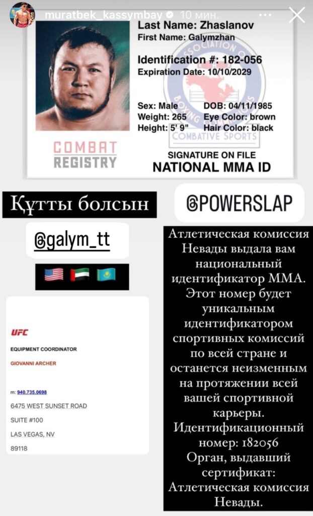 Галымжан Жасыланов по прозвищу Галым ТТ, получил лицензию Атлетической комиссии Невады для участия в Power Slap — промоушене Даны Уайта по пощечинам.