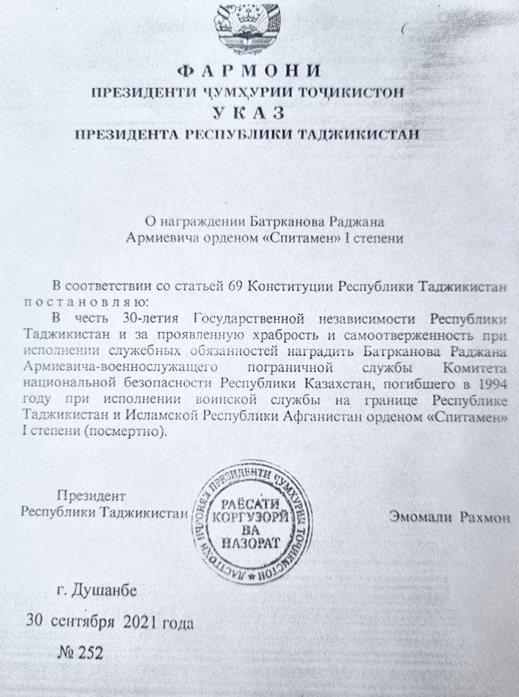 В Таджикистане же 30 сентября 2021 года указом президента Эмомали Рахмона казахскому пограничнику вручили орден "Спитамен" 1-й степени, хотя обычно его вручают только высшему офицерскому составу, например генералам.