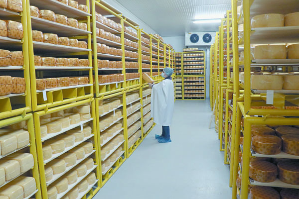 Стеллажи от пола до потолка заставлены головами сыра в упаковке под золото. Квадратные, круглые, прямоугольные – они созревают 45 дней. Странно, ты вот видел только, что как это всё сделали, а теперь перед тобой лежит тонн 20 готового сыра – полное впечатление золота. И только легкий запах сброженного молока.