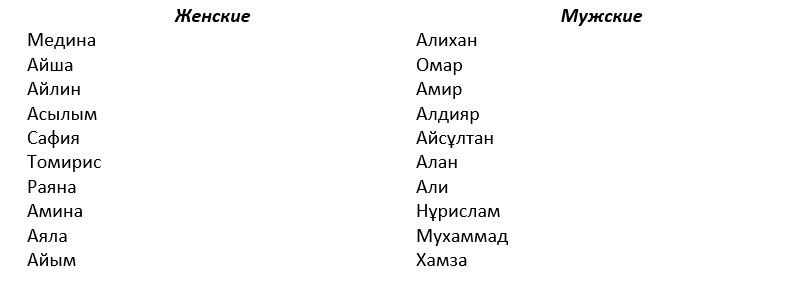 В Бюро нацстатистики Казахстана представлены самые популярные имена для детей, родившихся в 2023 году. Ниже приведены списки из 10 наиболее любимых женских и мужских имен.