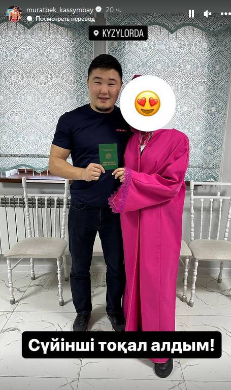 В руках он держит свидетельство о браке, заключенном в мечети по мусульманским обычаям, передает Caravan.kz. Пара заключила брак в Кызылорде. Лицо своей токал Муратбек Касымбай не показал.