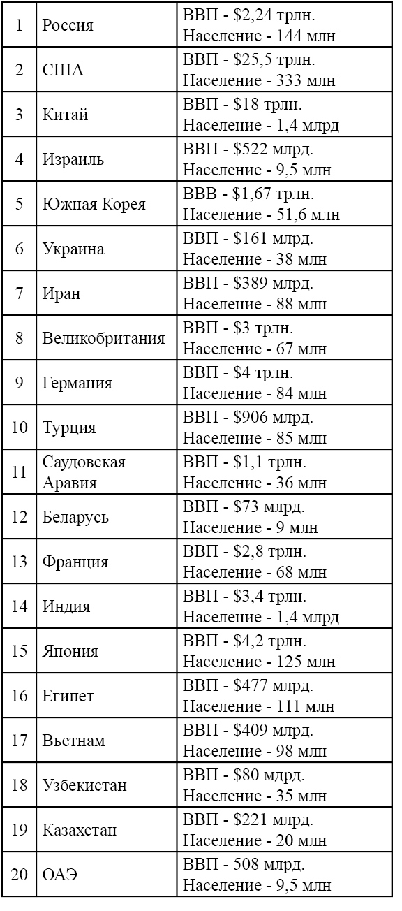 Примечательно, что в топ-20 сильнейших не вошли армии таких стран как Польша (25 место), Мексика (28 место), Канады (29 место), Бразилии (30 место).