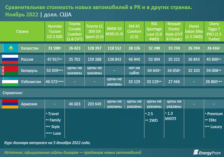 Интересно, что, по данным Energyprom, в прошлом ноябре минимальная разница в стоимости между одними и теми же автомобилями в Казахстане и в России составляла 6 тыс. долларов, а это по ноябрьскому курсу — примерно 2,7 млн тенге.