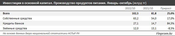 По итогам января-октября текущего года объём инвестиций в основной капитал в сфере производства продуктов питания достиг 102,3 миллиарда тенге — на 25 % больше, чем годом ранее. Реальный рост физического объёма инвестиций составил 21,1 %.