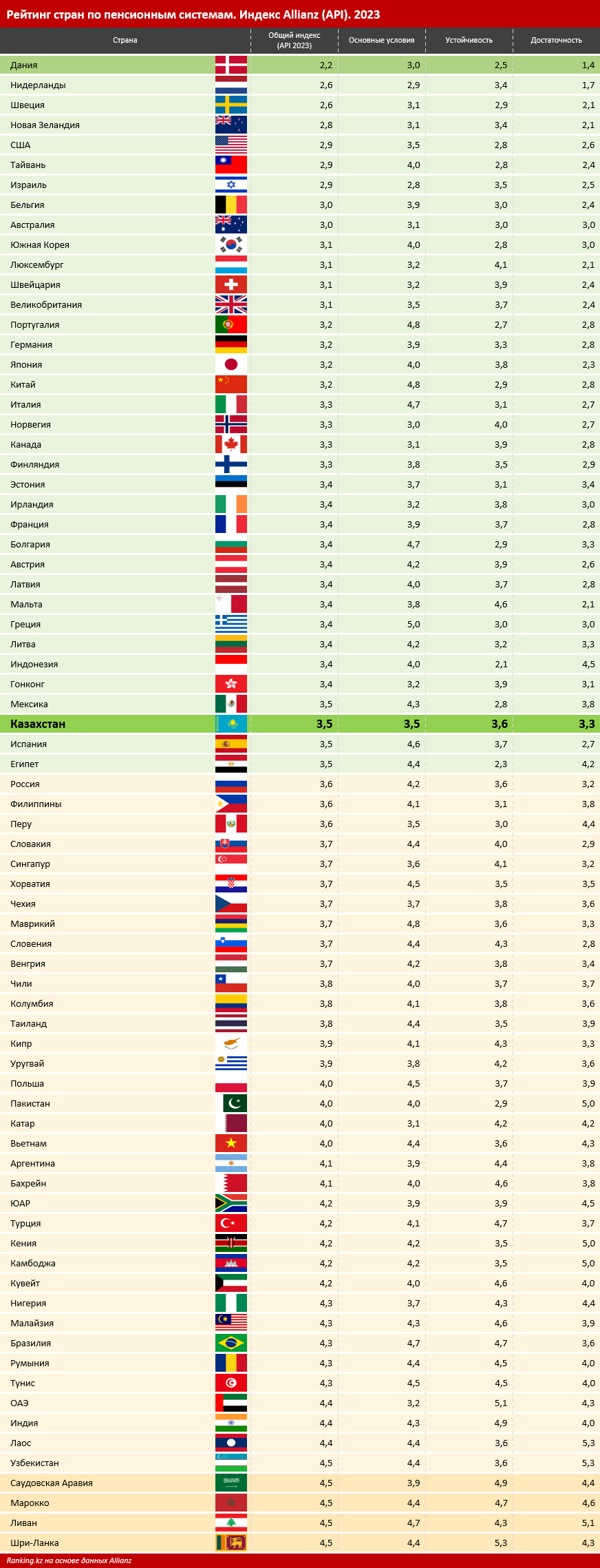 Зарубежная компания Allianz, занимающаяся управлением активами, составила новый рейтинг стран по пенсионному индексу, куда вошёл и Казахстан, передает со ссылкой на Ranking.kz.