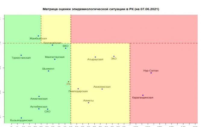 В "желтой" зоне: г. Алматы, Атырауская, Акмолинская, Западно-Казахстанская и Павлодарская области.