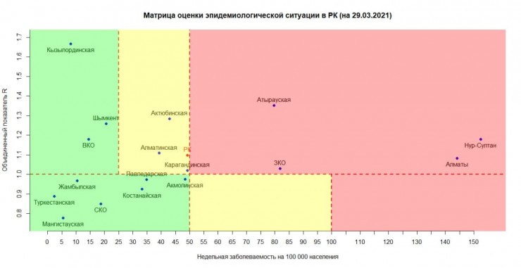 По данным матрицы, в "красной" зоне 29 марта по-прежнему находятся Нур-Султан, Алматы, Атырауская и Западно-Казахстанская области.