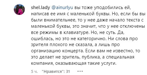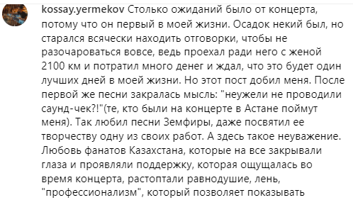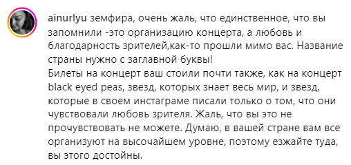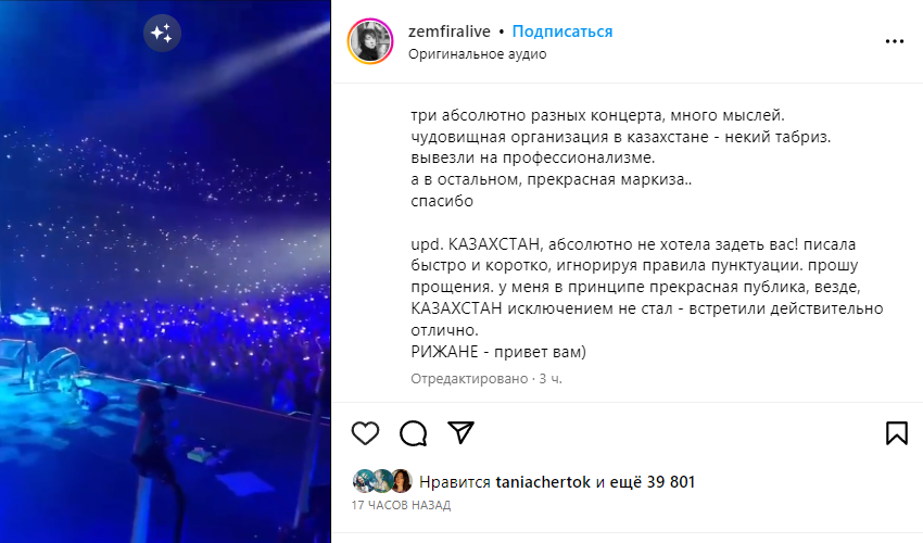 Сама Земфира вскоре изменила пост, добавив: "КАЗАХСТАН, абсолютно не хотела задеть вас! писала быстро и коротко, игнорируя правила пунктуации. прошу прощения. у меня в принципе прекрасная публика, везде, КАЗАХСТАН исключением не стал — встретили действительно отлично."