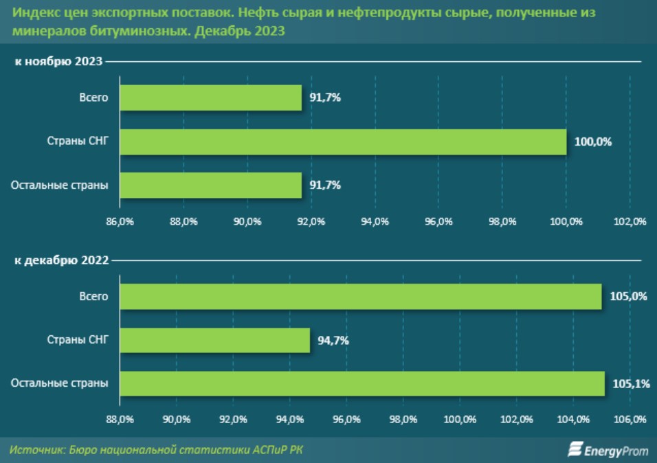 В декабре прошлого года экспортные цены на сырую нефть и нефтепродукты снизились на 8,3 %. В месячной динамике цены для стран СНГ остались на предыдущем уровне, а для остальных стран — уменьшились.