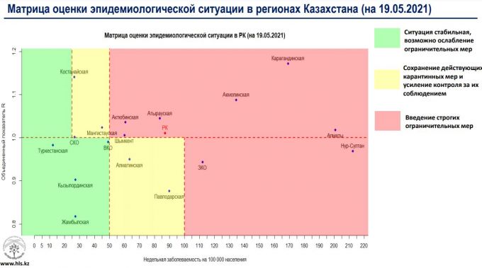 Согласно матрице оценки на 19 мая, Шымкент снова вернулся в "красную" зону. Также там находятся: Алматы, Нур-Султан, Актюбинская, Акмолинская, Атырауская, Карагандинская области, ЗКО.
