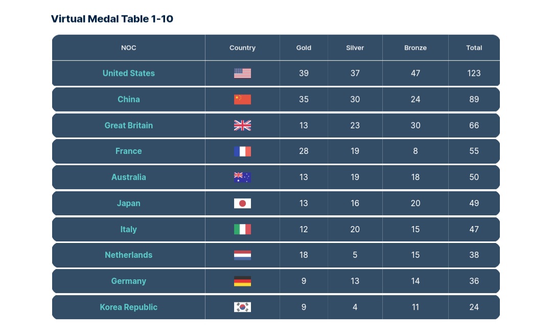 В топ-3, по мнению аналитиков, попадут США (39-37-47=123 медали), Китай (35-30-24=89 наград) и Великобритания (13-23-30=66 медалей). Хозяевам соревнований — сборной Франции — пророчат только 4 место (28-19-8=55 наград).