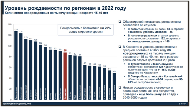 В Казахстане уровень рождаемости в 2022 году в среднем составил 88 новорожденных на тысячу женщин возраста от 15 до 49 лет. Это почти на треть больше мирового уровня. В развитых странах рождаемость равна 43, в странах с высоким уровнем доходов – 45. В наименее развитых странах уровень рождаемости составляет 122, в странах с низким уровнем доходов – 140.