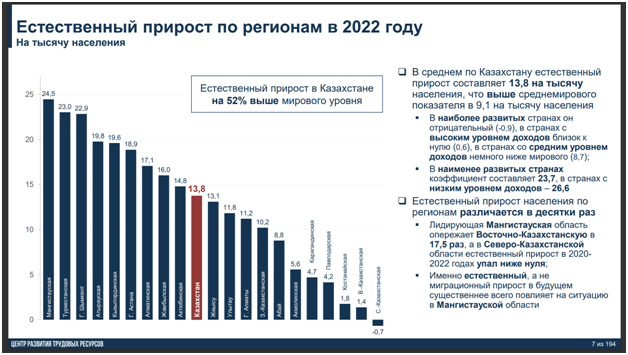 В среднем по Казахстану естественный прирост составляет 13,8 на тысячу населения. Это выше среднемирового показателя в 9,1 на тысячу населения. В наиболее развитых странах он отрицательный (-0,9), в странах с высоким уровнем доходов близок к нулю. В странах со средним уровнем доходов немного ниже мирового (8,7). В наименее развитых странах коэффициент составляет 23,7-26,6.