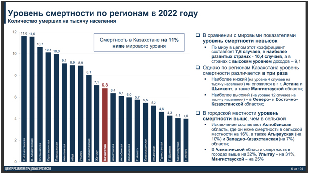 В сравнении с мировыми показателями уровень смертности в Казахстане невысокий: по миру в целом этот коэффициент составляет 7,6 случая, в наиболее развитых странах — 10,4 случая, а в странах с высоким уровнем доходов – 9,1.