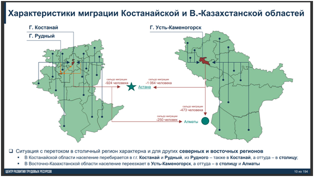 Ситуация с перетоком в столичный регион характерна для всего севера и востока страны. В Костанайской области население перебирается в г.г. Костанай и Рудный, из Рудного – также в Костанай, а оттуда – в столицу. В ВКО население переезжает в Усть-Каменогорск, а оттуда – в столицу и Алматы.