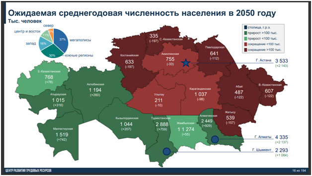 Казахстан четко делится на две популяционные зоны: Запад-Юг и Центр-Север. В первом идет бурный рост населения, во втором – депопуляция. И это отражается во всем исследовании.
