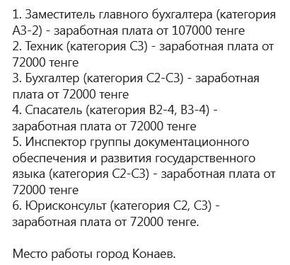 "1. Заместитель главного бухгалтера (категория А3-2) — заработная плата от 107000 тенге;