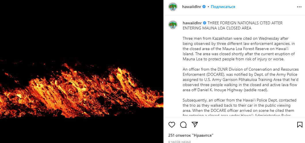 В департаменте природных ресурсов Гавайев сообщили о том, что возле действующего вулкана задержали троих казахстанцев, передает медиа-портал Сaravan.kz.