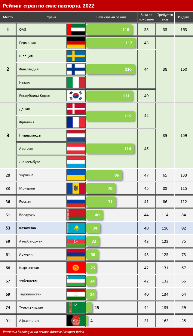 Аналитики ranking сообщили, что в 2022 году Казахстан занял 53 место из 91 в рейтинге стран по силе паспорта.