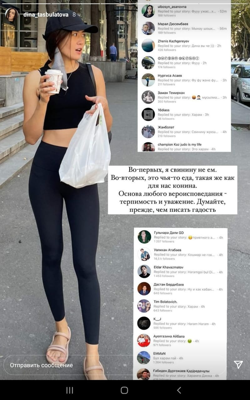 Позже Тасбулатова показала, что ей написали много грубых сообщений по поводу той фотографии, например: "Харам", "Фу-у", "Свинину жрёшь" и тому подобное. На это артистка отреагировала: "Во-первых, я свинину не ем. Во-вторых, это чья-то еда, такая же, как для нас конина. Основа любого вероисповедания — терпимость и уважение. Думайте, прежде чем писать гадость".