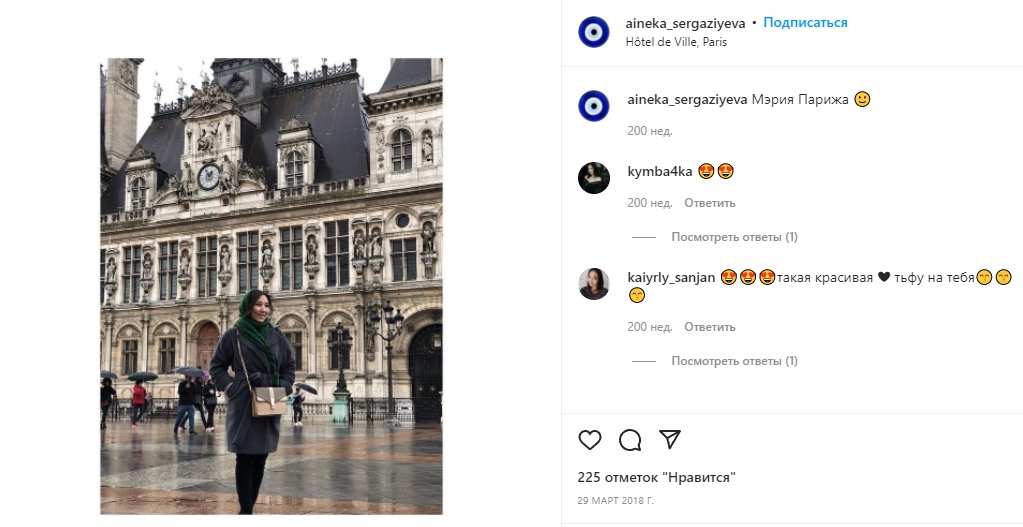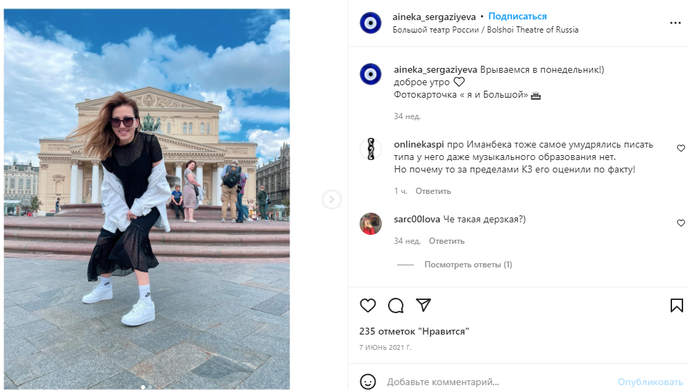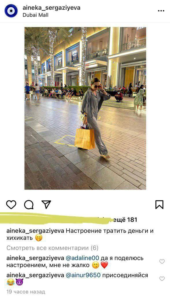 Она написала в посте: "Настроение тратить деньги и хихикать". Судя по данным социальной сети, Сергазиева находилась в Дубае в тот момент. Позже пост со страницы пропал, но скриншоты сохранились в Сети: