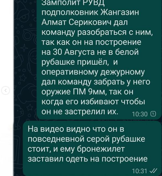 Сегодня в группе появилось видео, на котором полицейский избивает подчинённого. Сообщили, что заместитель начальника управления полиции Наурызбайского района, майор полиции К.Е. Джакипбаев систематически избивает молодых сотрудников.