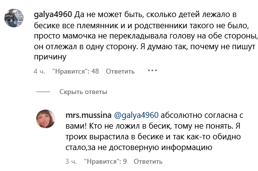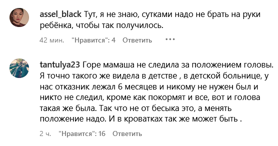 Однако большинство комментаторов написали, что дело, скорее всего, не в бесике, а в том, что за ребенком не ухаживали как следует, не меняли регулярно положение его головы и тд. Одна женщина привела в пример отказника из больницы, который лежал не в бесике, но его голова была такой же формы, так как его не перекладывали с необходимой частотой. Другие поделились собственным опытом использования бесика, в том числе из поколения в поколение.