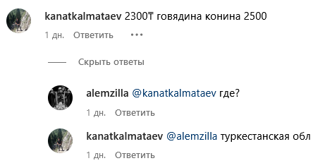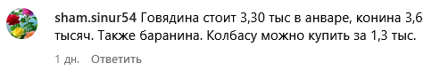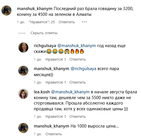Цены на мясо в Алматы оказались самимыми высокими. Одна женщина рассказала в комментариях, что не смогла найти на Зеленом базаре конину дешевле 5,5 тыс. тенге. Другие комментаторы назвали следующие числа: