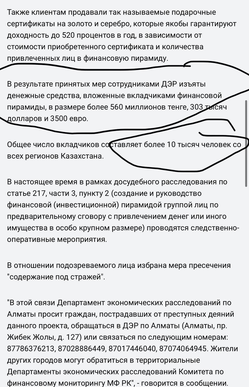 Однако автор канала задался вопросом насчёт остальных денег и вкладчиков: "В АФМ забыли сообщить свою же информацию, согласно которой у злоумышленников изъяли 560 миллионов тенге, а пострадавших по делу якобы было 10 тысяч. Внимание, вопрос: куда пропали 437 миллионов тенге и 9877 вкладчиков?"