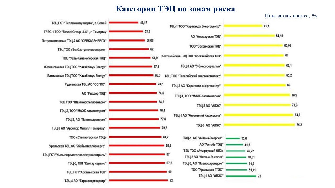 В данный момент, по информации министерства энергетики, 19 из 37 теплоэлектроцентралей в Казахстане находятся в аварийном состоянии, то есть входят в «красную зону», в «жёлтую» – 11 и в «зелёную» – семь. Для ремонта самых изношенных ТЭЦ, по предварительным данным Минэнерго, потребуется 182 миллиарда тенге.