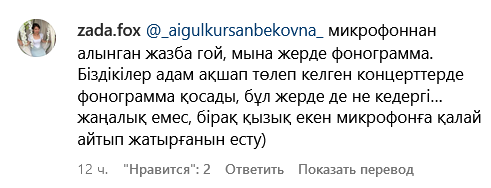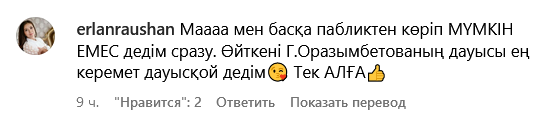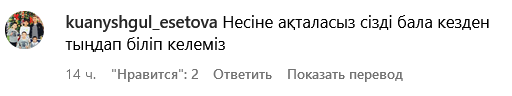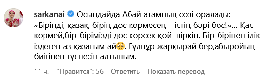 "Повторю слова Абая: "Если казахи не будут видеть друг в друге друзей, все напрасно". Эх, казахи мои, только ищут, к чему бы придраться. Гульнур, золотая моя, продолжай сиять, держись и дальше на высоте".