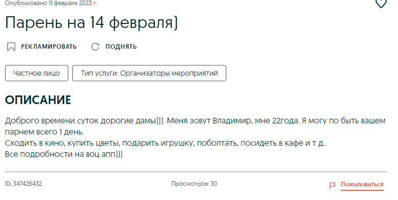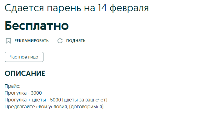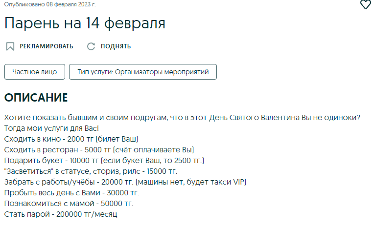 На сайте OLX появились свежие объявления от казахстанцев, которые предлагают услуги "парня на 14 февраля", передает медиа-портал Сaravan.kz.