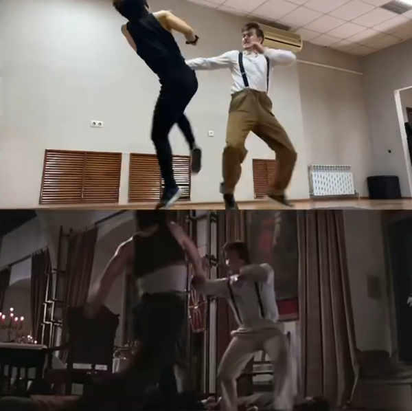 Есть пародия, где я дерусь со своим другом, там момент, когда я пинаю кубик, и он должен четко залететь ему в голову, или когда нужно ногой подбить шариковую ручку так, чтобы она правильно упала в руки, эти трюки тоже было непросто повторить.