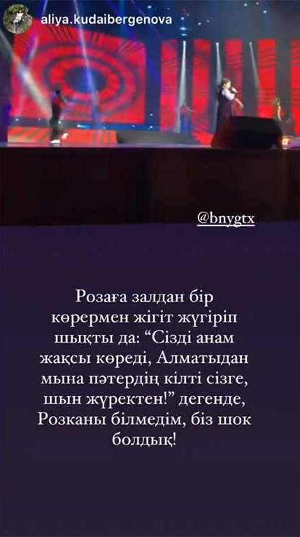 "К Розе из зала выбежал зритель и сказал: "Моя мама вас любит. От чистого сердца дарю вам эти ключи от квартиры в Алматы". Мы все были в шоке", — рассказала журналистка Алия Кудайбергенова, ставшая свидетельницей поздравления.