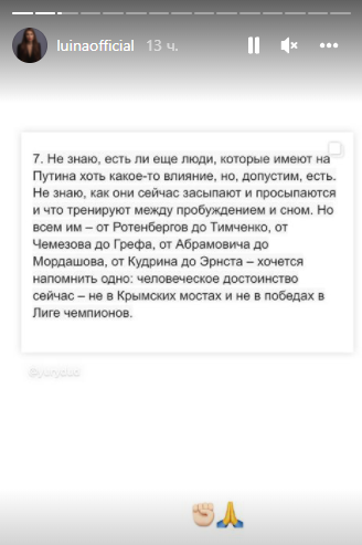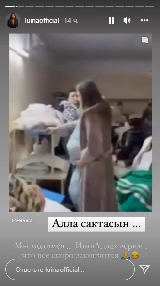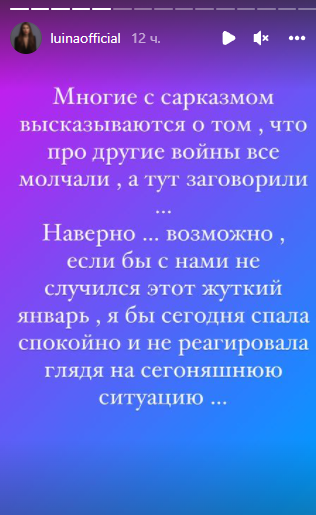 Также Луина вспомнила январские события в Казахстане: "Многие с сарказмом высказываются о том, что про другие войны все молчали, а тут заговорили… Возможно, если бы с нами не случился этот жуткий январь, я бы сегодня спала спокойно и не реагировала, глядя на сегодняшнюю ситуацию".