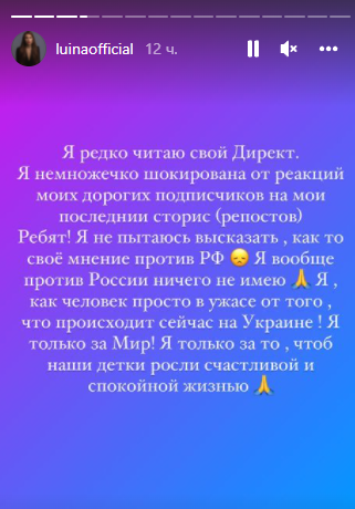 После этого она сообщила, что ей стали писать об этом в личные сообщения: "Я редко читаю свой директ. Я немножечко шокирована от реакции моих дорогих подписчиков на мои последние сторис (репосты). Ребят! Я не пытаюсь высказать как-то своё мнение против РФ. Я вообще против России ничего не имею. Я, как человек, просто в ужасе от того, что происходит сейчас в Украине! Я только за мир! Я только за то, чтоб наши детки росли счастливой и спокойной жизнью!"