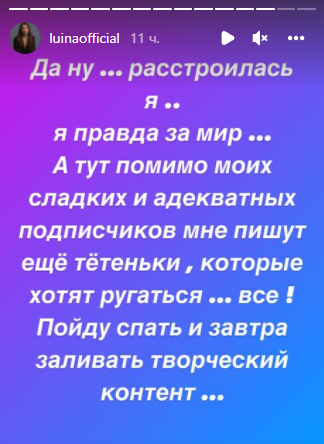 Казахстанская певица Луина рассказала на странице в Instagram, что с ней стали больше ругаться после её сториз про Украину, передает медиа-портал Сaravan.kz.