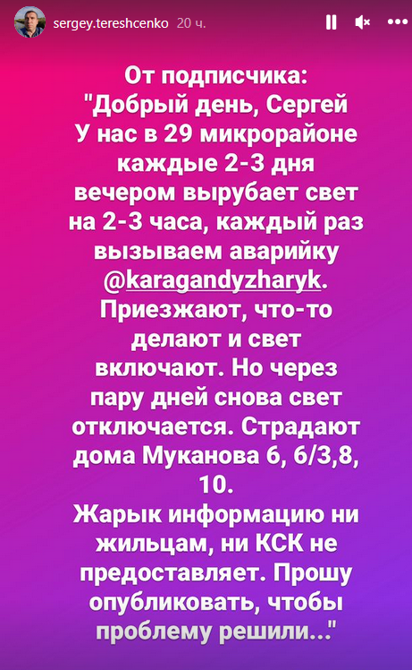 "У нас в 29 микрорайоне каждые 2-3 дня вечером вырубается свет на 2-3 часа, каждый раз вызываем аварийку "Қарағанды Жарық". Приезжают, что-то делают и свет включают. Но через пару дней свет снова отключается. "Жарық" информацию ни жильцам, ни КСК не предоставляет", — написал карагандинец в жалобе.