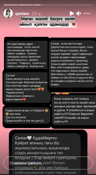 Девушке пишут люди, восхищаясь её творчеством и признаваясь, что нашли её именно благодаря протестному посту бизнесмена Кайрата Кудайбергена.